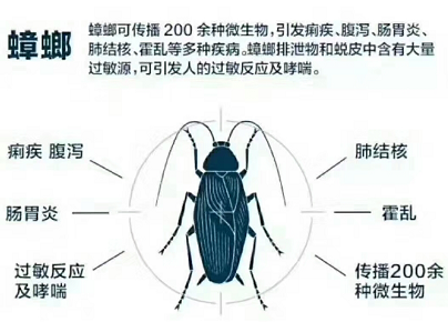 蟑螂传播的主要疾病:能传播多种疾病,主要是肠道疾病 、有科学家指出可传播SARS病毒. 蟑螂传播疾病方式及主要种类:携带痢疾杆菌、沙门氏菌、铜绿假单孢杆菌、金黄色葡萄球菌、链球菌、大肠杆菌等致病菌和钩虫、蛲虫、蛔虫等寄生卵及肝炎病毒、素等。